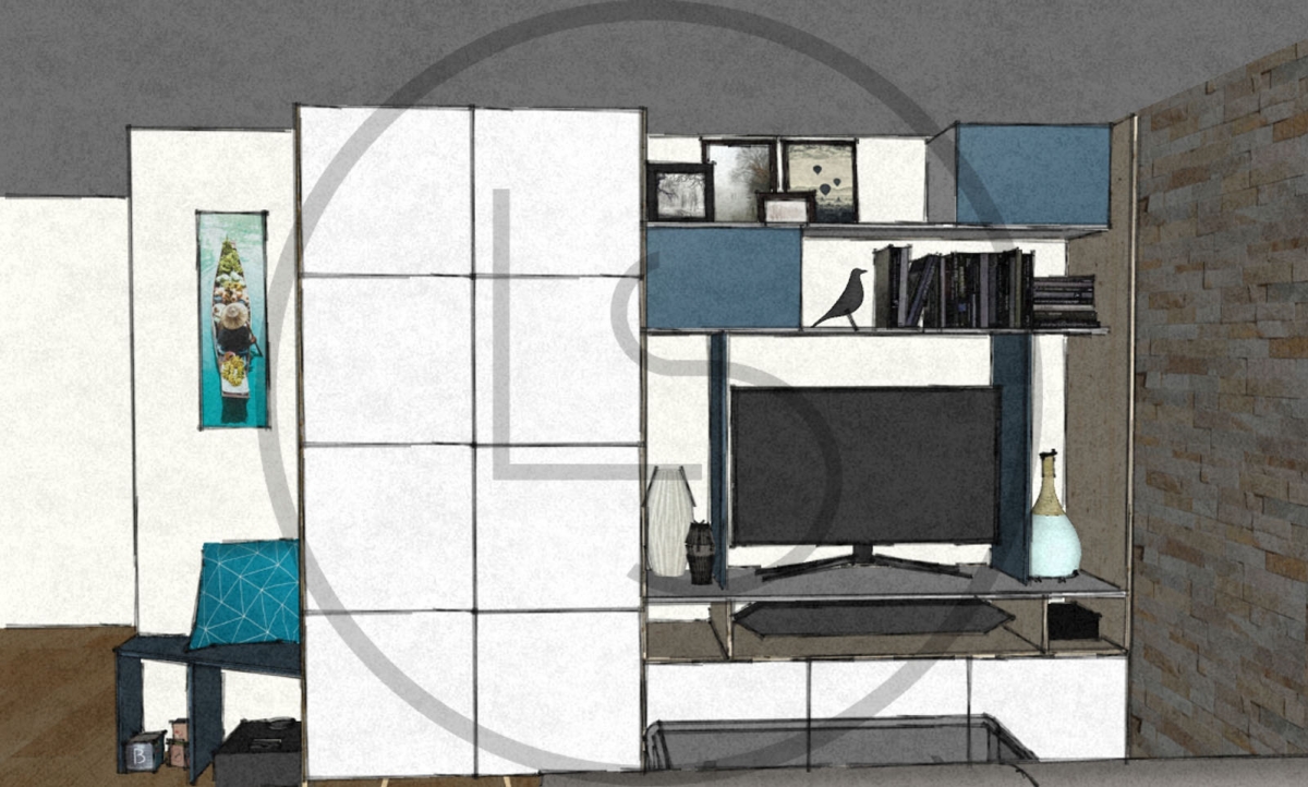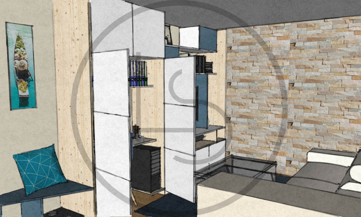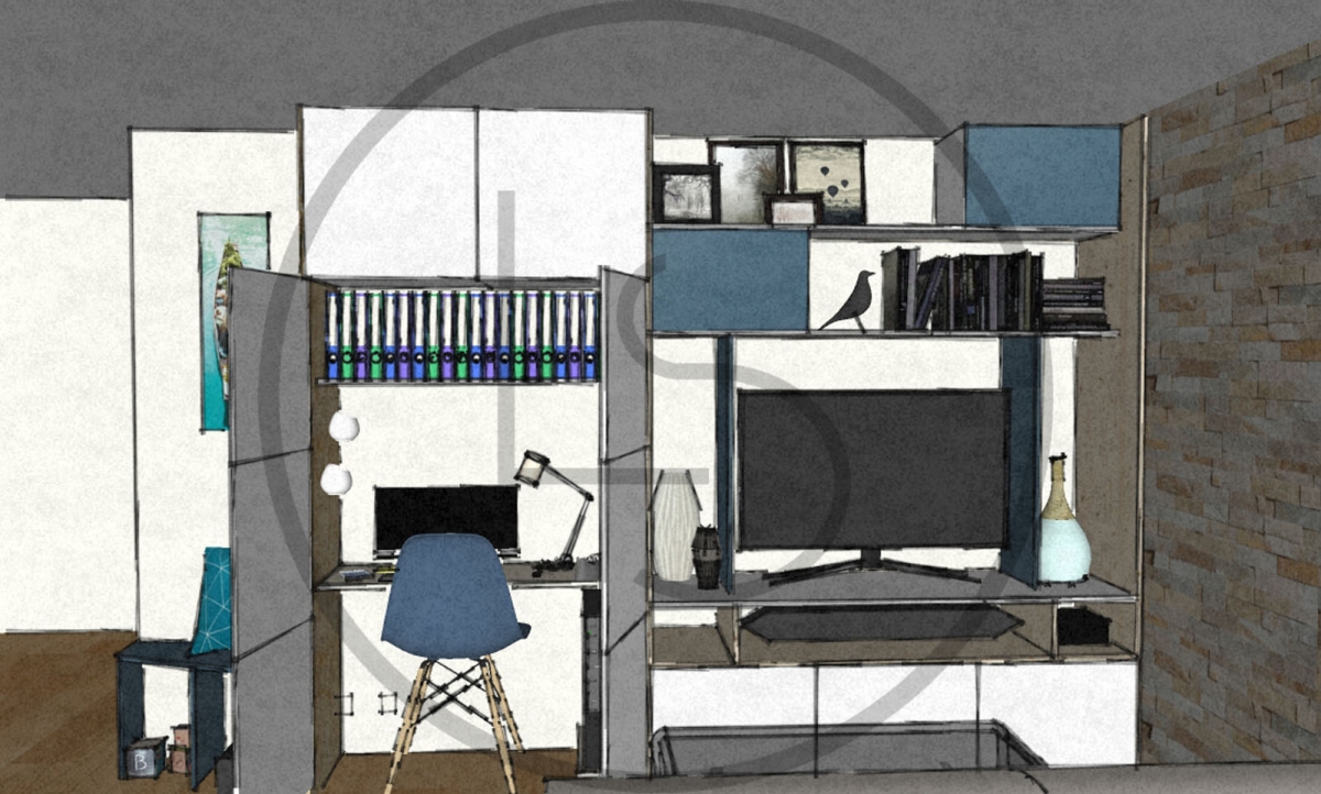Dans un appartement en banlieue parisienne un jeune couple avec un enfant en bas âge avait besoin de créer un espace bureau / meuble TV / rangement dans leur salon. Il a fallut penser ce meuble comme une grande boîte dans laquelle chaque fonction est une autre petite boîte . Profil et Travaux : Appartement / 2 chambres / salle de douche / cuisine / salon. Création d’un meuble bureau dans l’espace Salon/Salle à Manger.